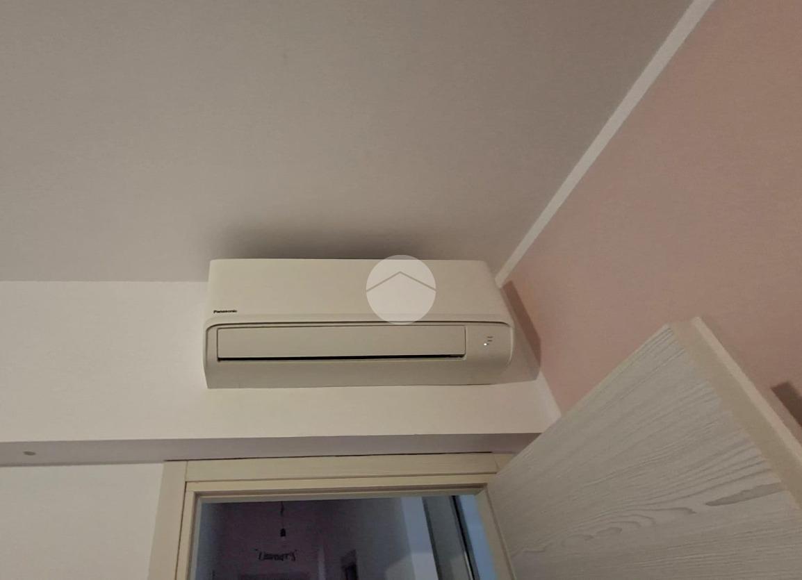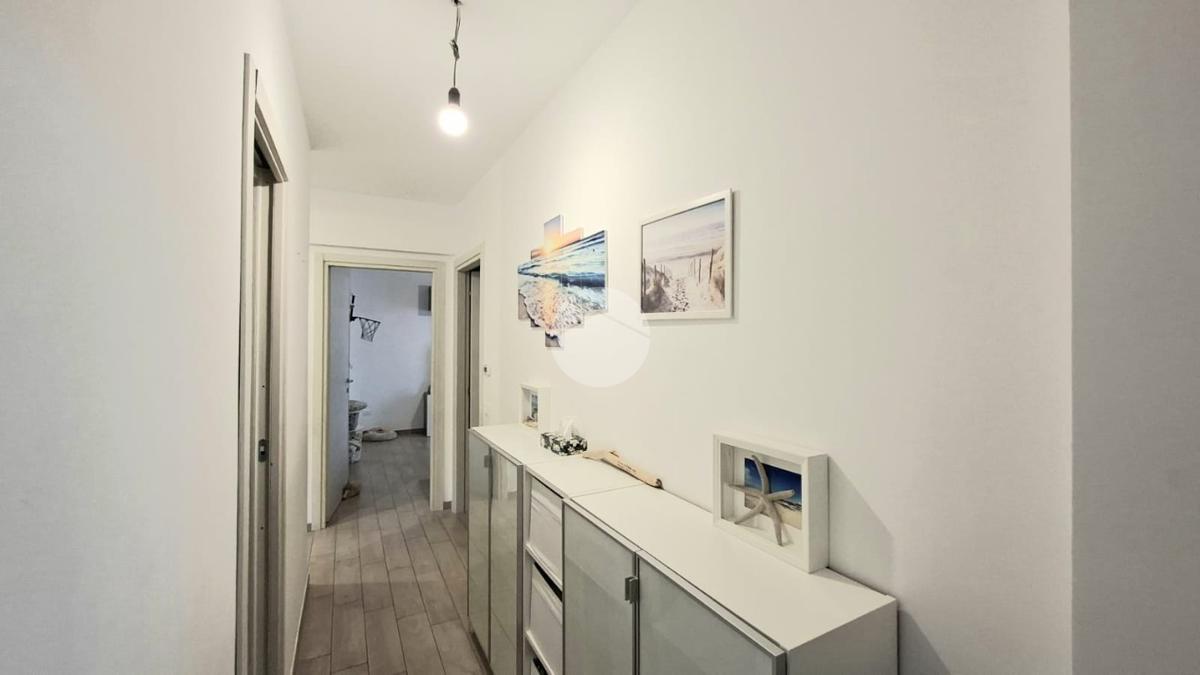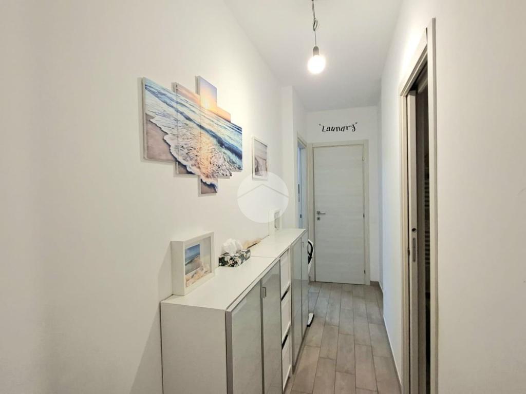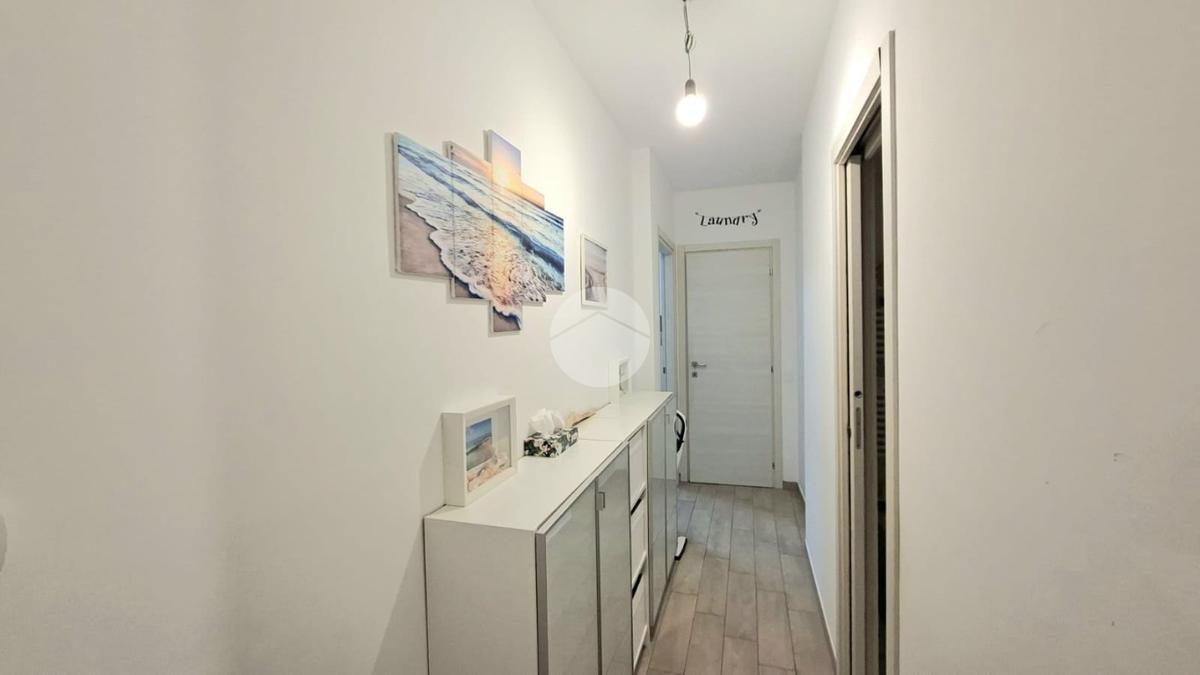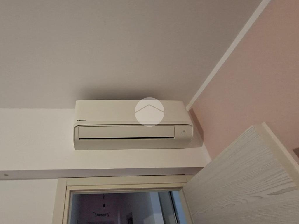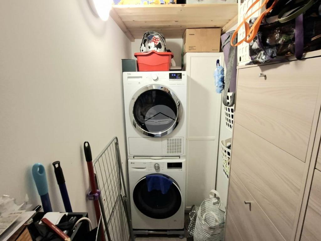 La cucina e la sala sono entrambe dotate di aria condizionata, due camere da letto, bagno con doccia e una pratica dispensa con colonna lavanderia.