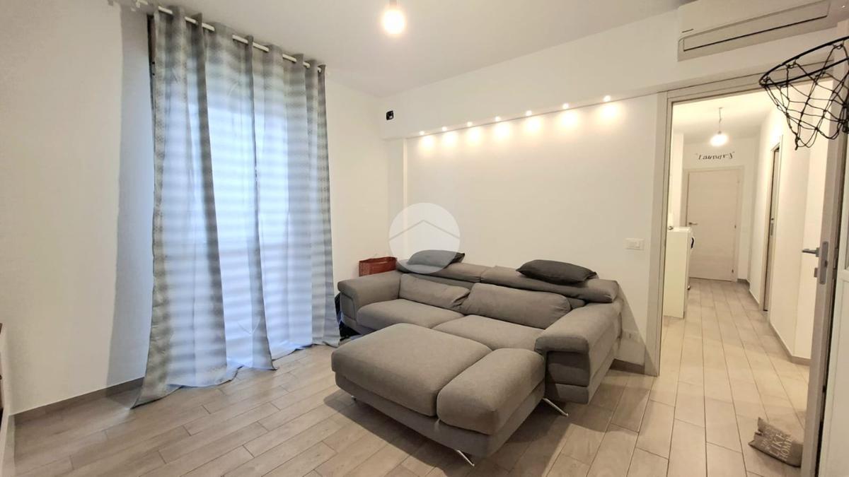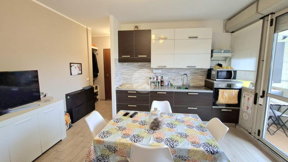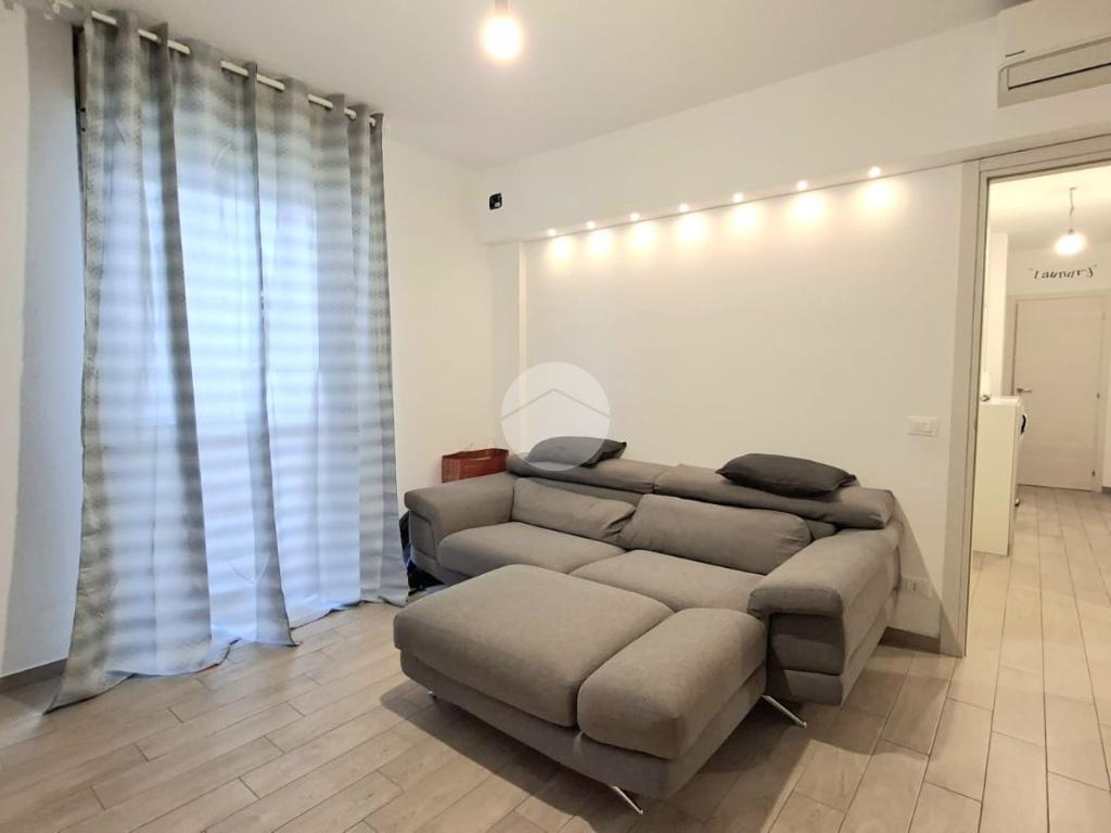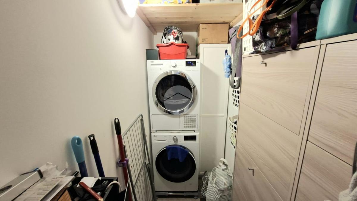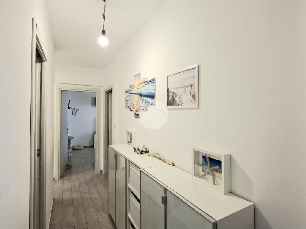 La cucina e la sala sono entrambe dotate di aria condizionata, due camere da letto, bagno con doccia e una pratica dispensa con colonna lavanderia.